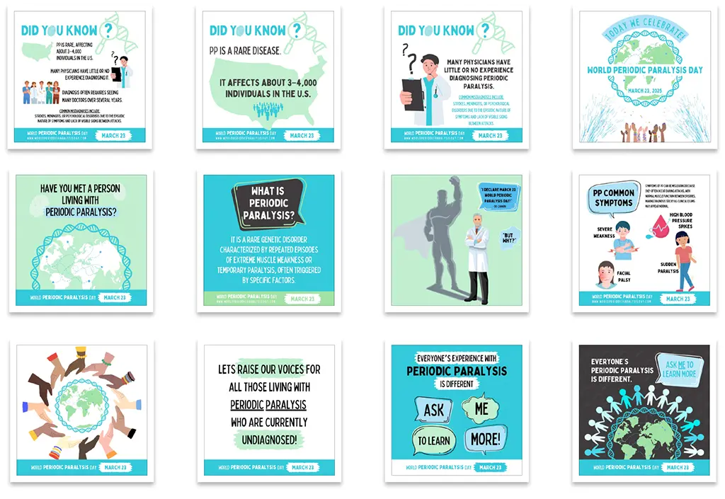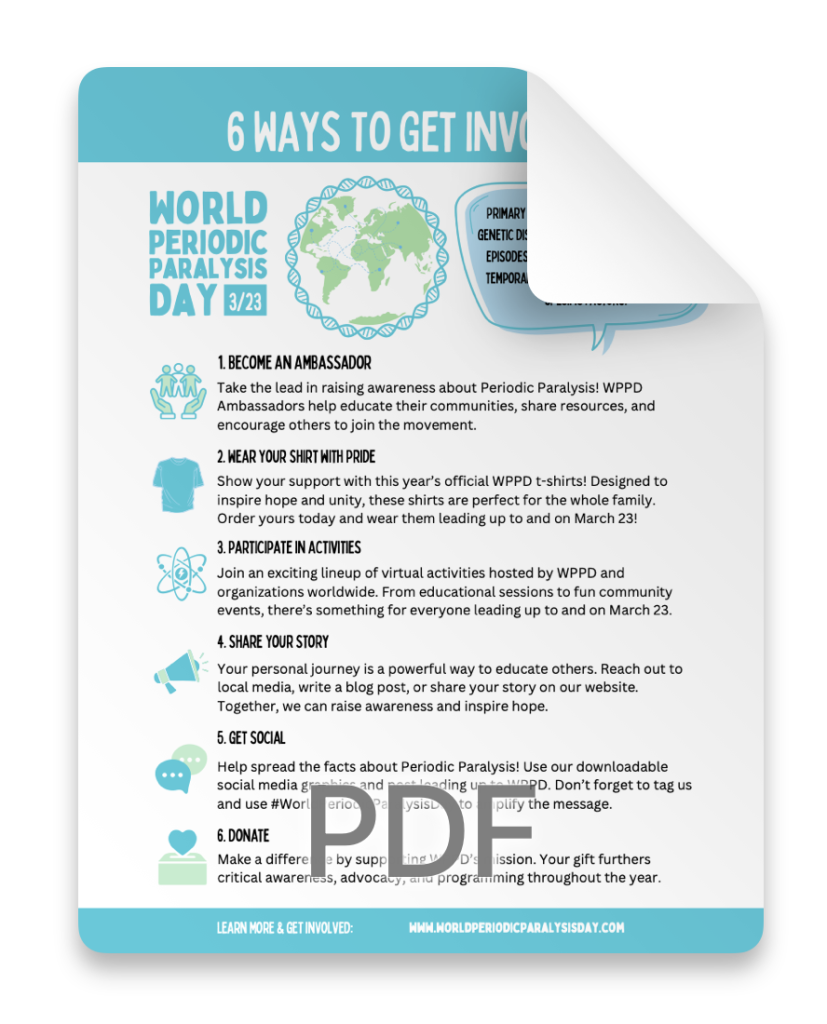 By signing up as a Power Partner, you’ll play a vital role in spreading awareness and advocating for the periodic paralysis community. When you sign up, you’ll get access to our Virtual Toolkit to amplify your voice, connect with others, and advocate for the Periodic Paralysis community. The Virtual Toolkit includes customizable templates, social media graphics, fact sheets, and more to help you make a difference on World Periodic Paralysis Day and beyond.